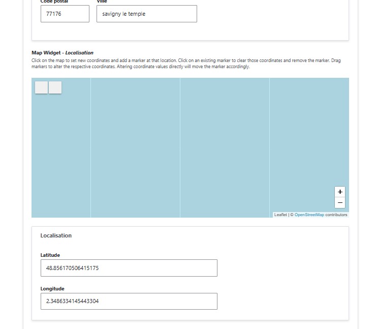 Le widget de géolocalisations ne fonctionne pas. Lorsque l'on rentre une nouvelle adresse, cela supprime les coordonnées GPS et inversement.